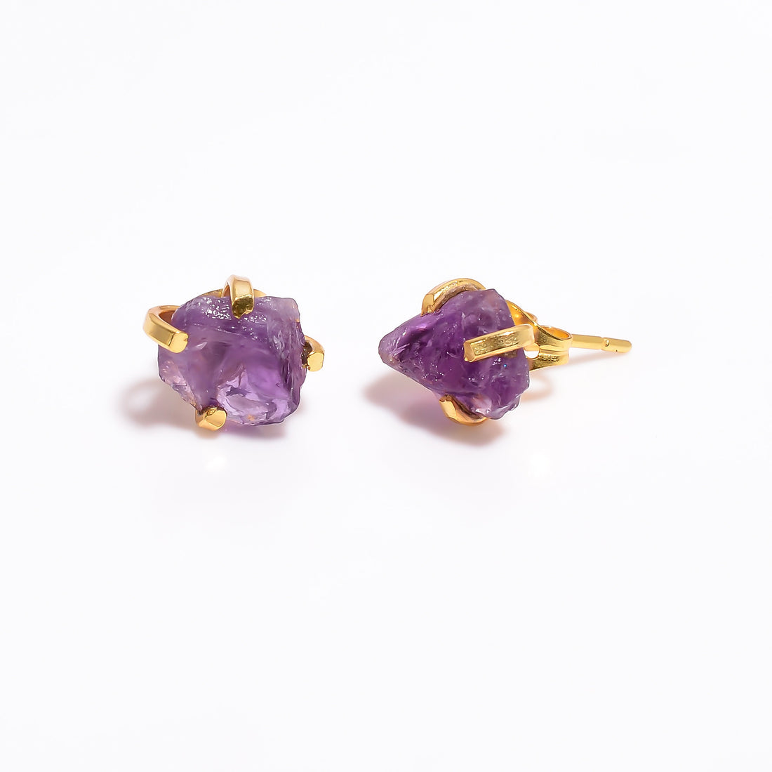 18K Gold Plated Brass Earrings Natural Rough Amethyst Gemstone Stud Earrings