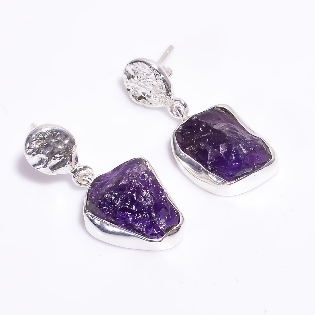 Natural Amethyst Raw Gemstone 925 Sterling Silver Earrings