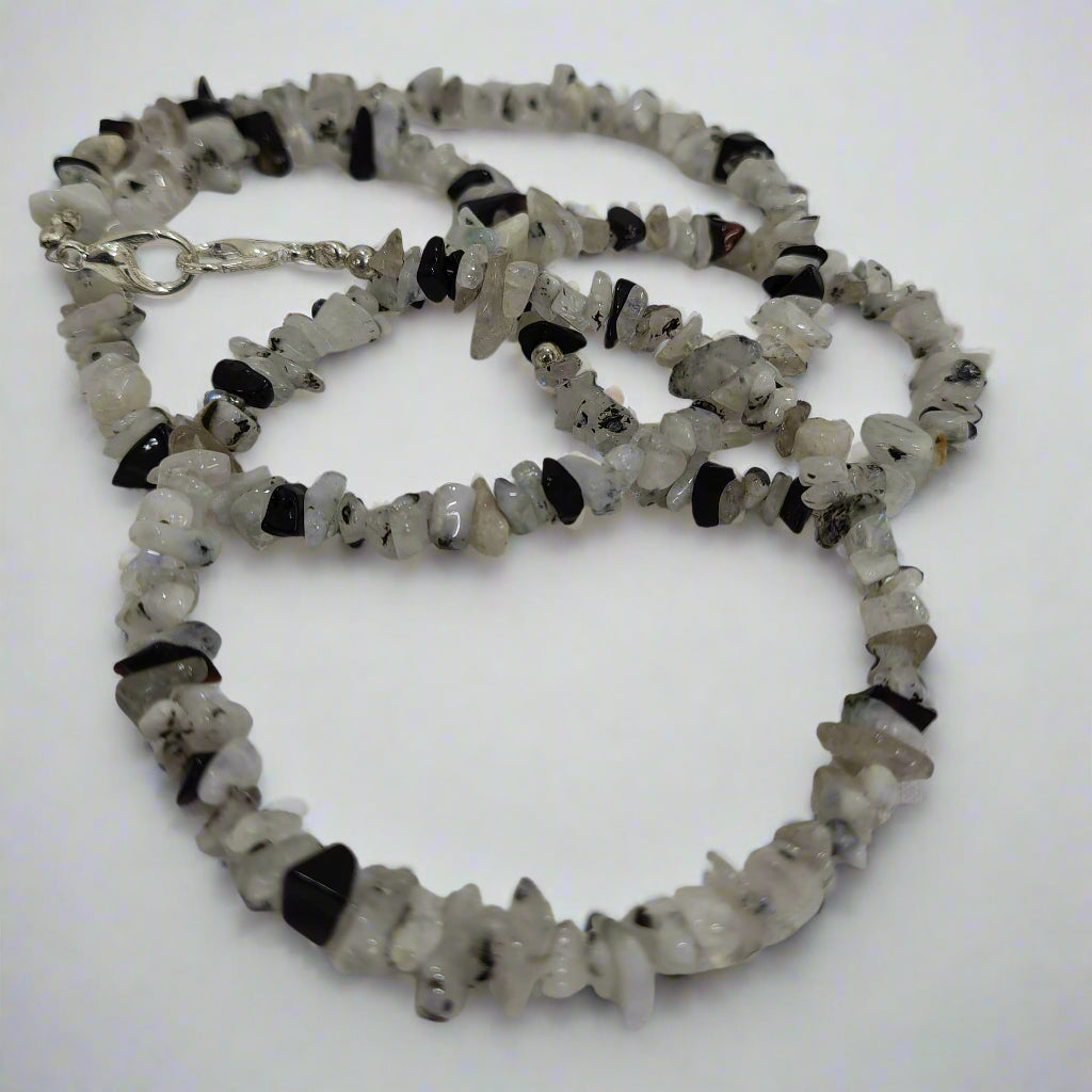 A beautifully handcrafted stone bead necklace featuring natural chip stones strung together for a raw,...