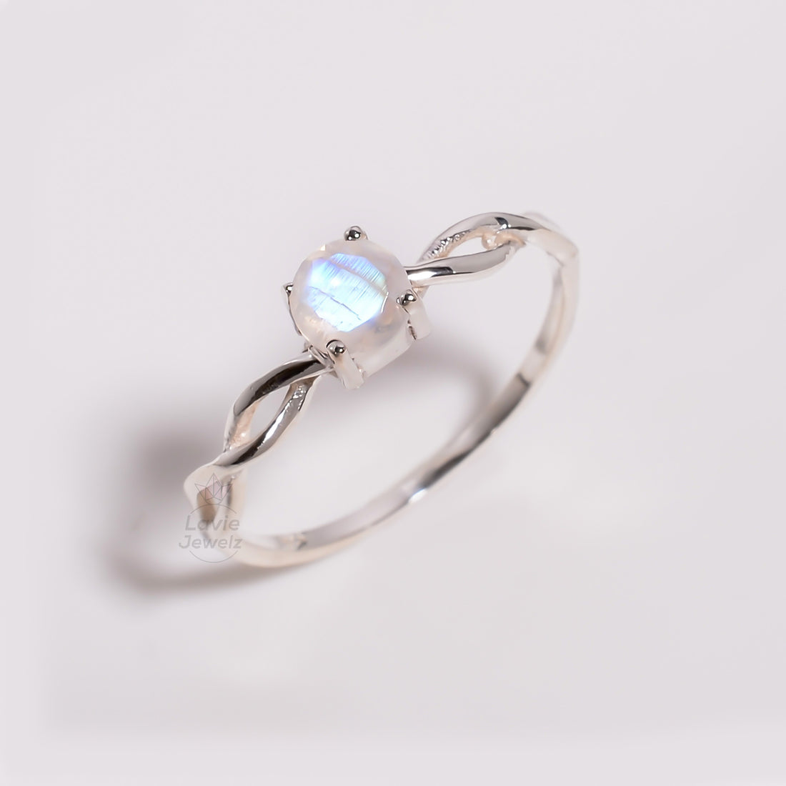 Natural Round Cut Rainbow Moonstone Minimalist Ring 925 Sterling Silver Ring