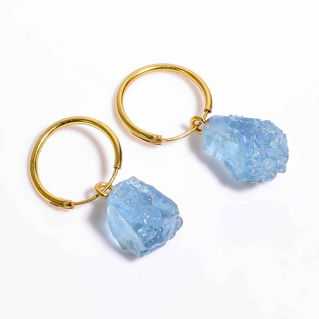 Natural Raw Aquamarine Gemstone 925 Sterling Silver Gold Plated Hoop Earrings