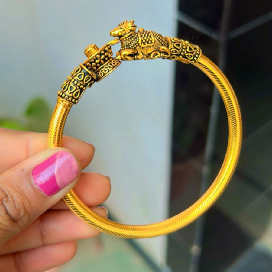 Add a touch of royal elegance with this Antique Gold Kada featuring an intricately carved Nandi motif. Crafted with traditional detailing and a secure clasp, it’s perfect for ethnic occasions, poojas, or as a bold statement in your daily wear.