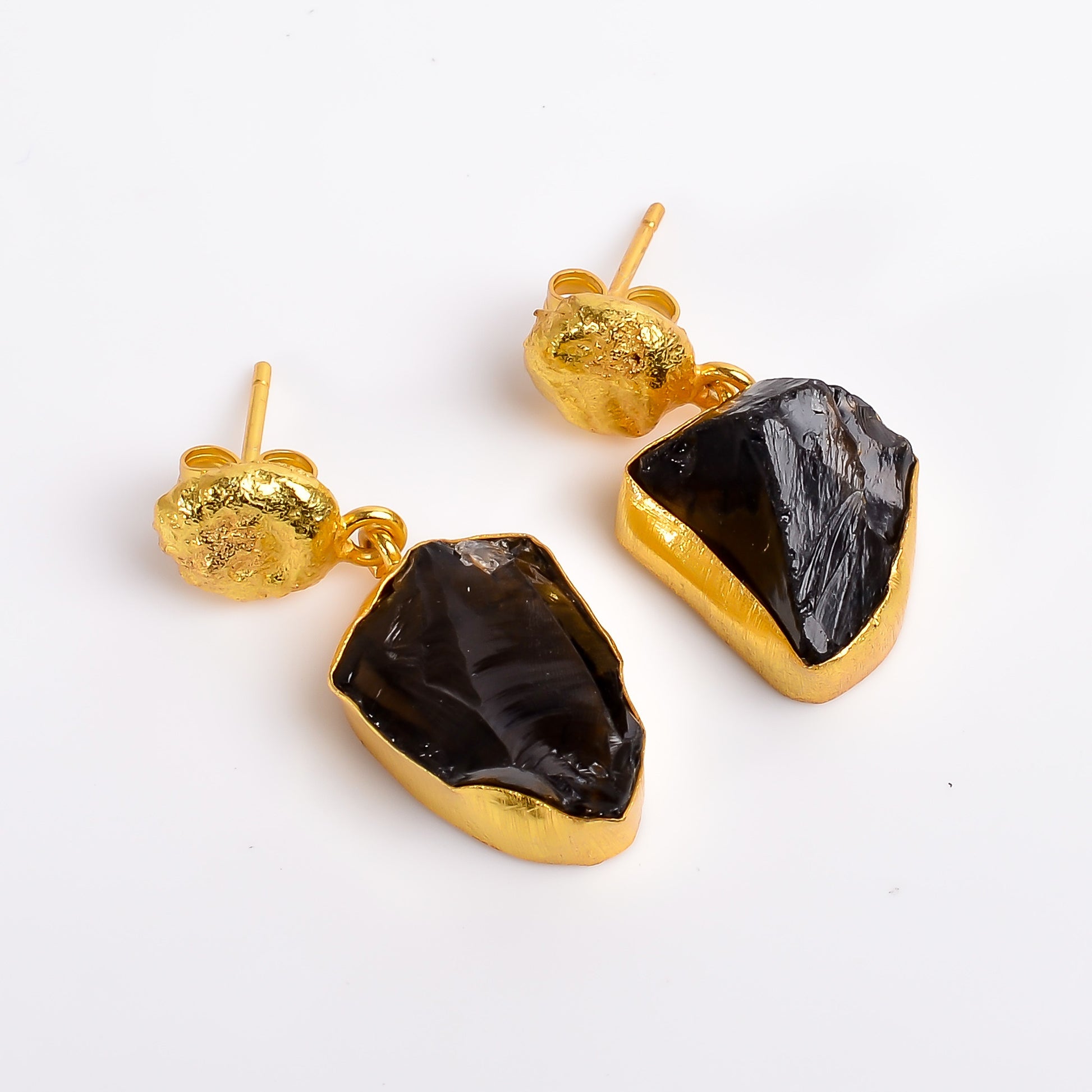 Smoky Quartz Rough Gemstone 18K Gold Plated Earrings