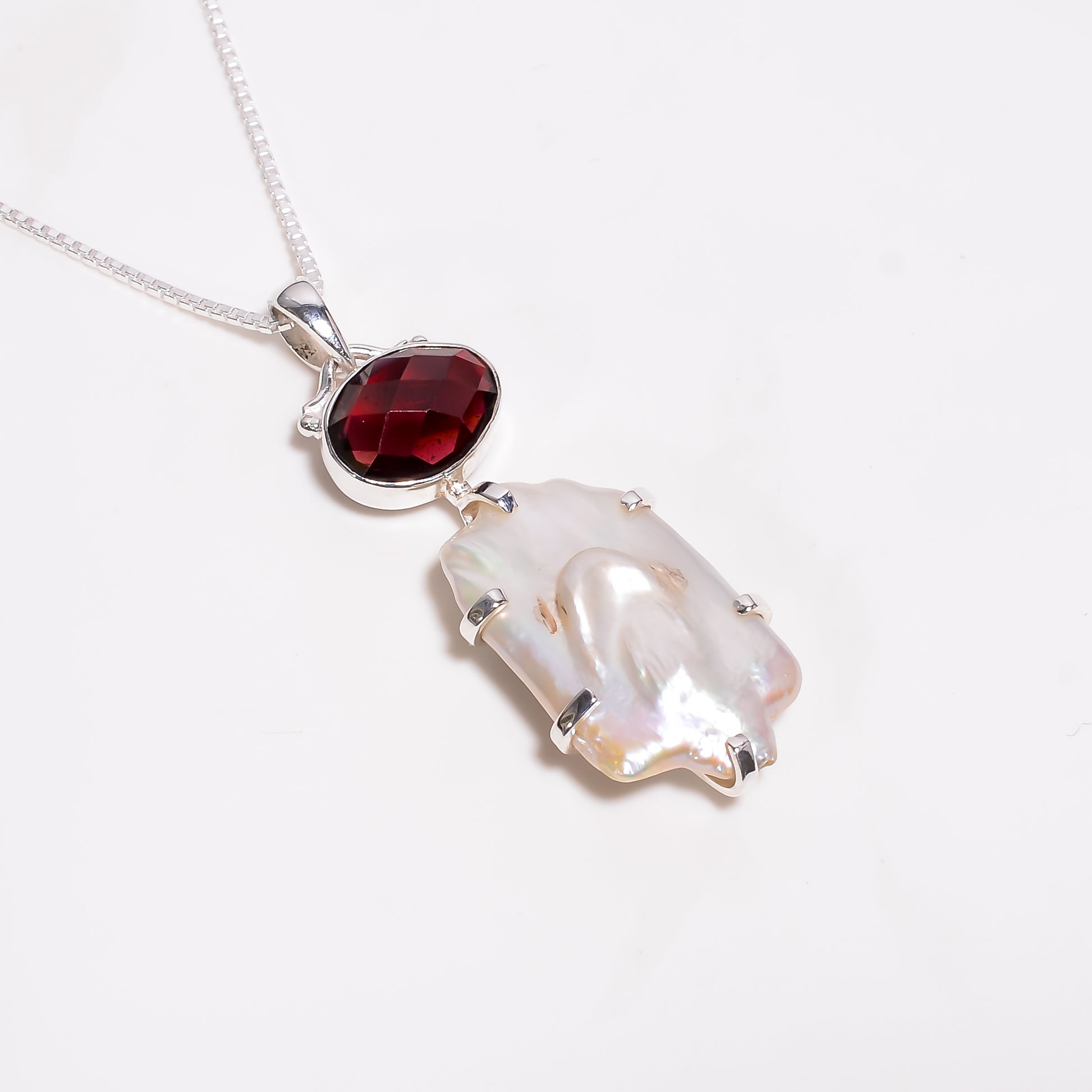 Rose Cut Garnet Baroque Pearl Gemstone 925 Sterling Silver Chain Pendant Necklace