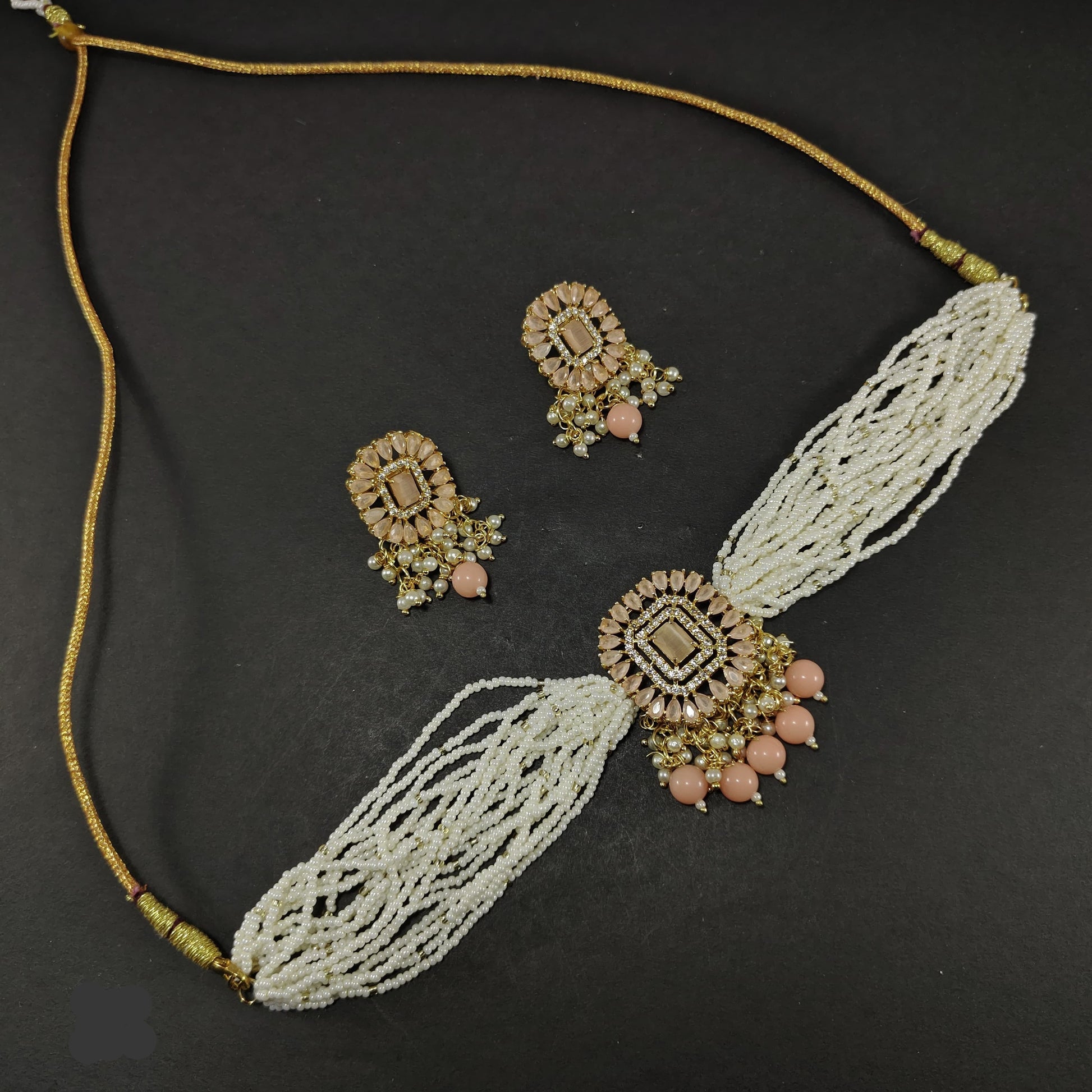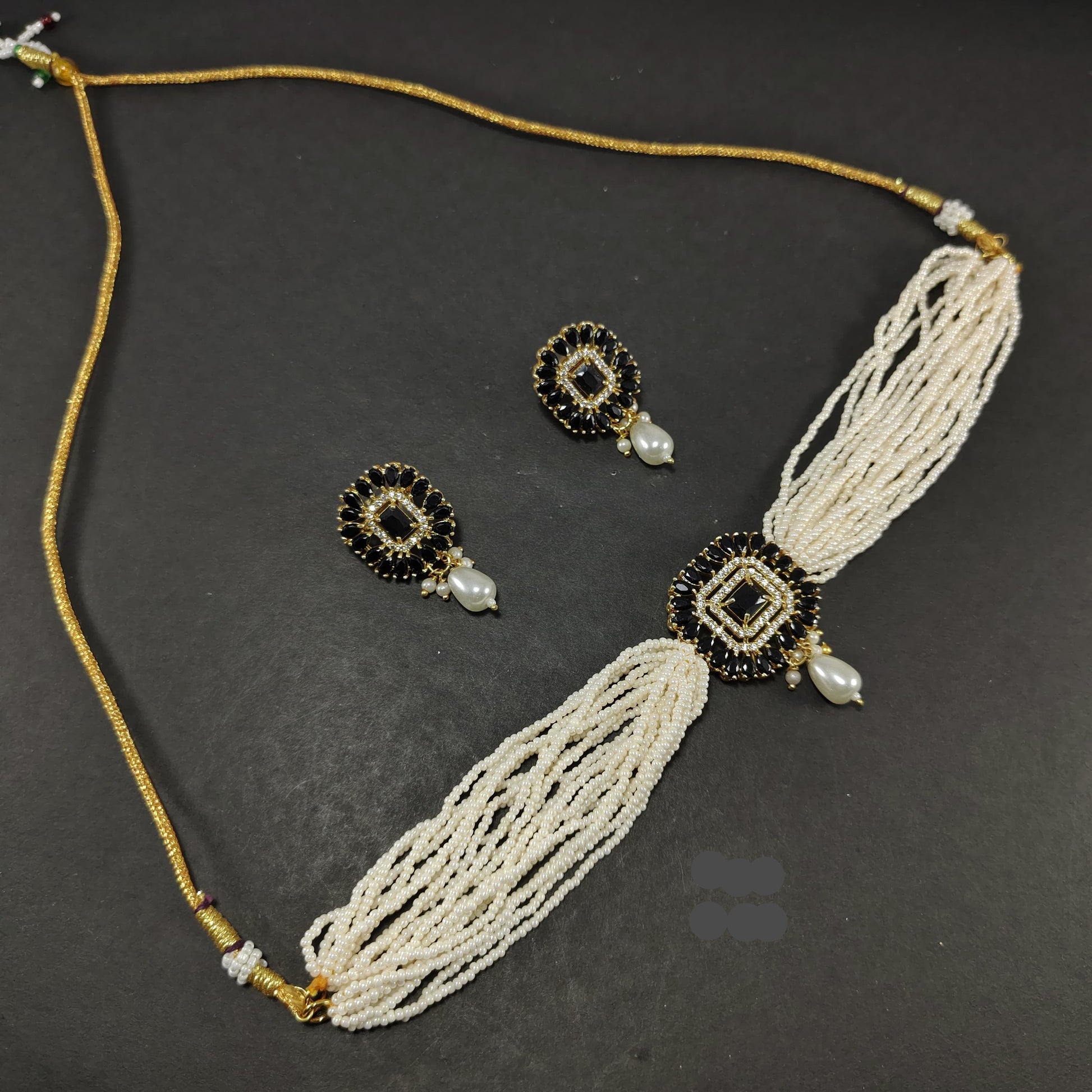 Elevate your traditional look with this elegant black and pearl beaded choker set. Featuring intricate beadwork, a striking centerpiece, and matching earrings — perfect for festive and ethnic occasions.
