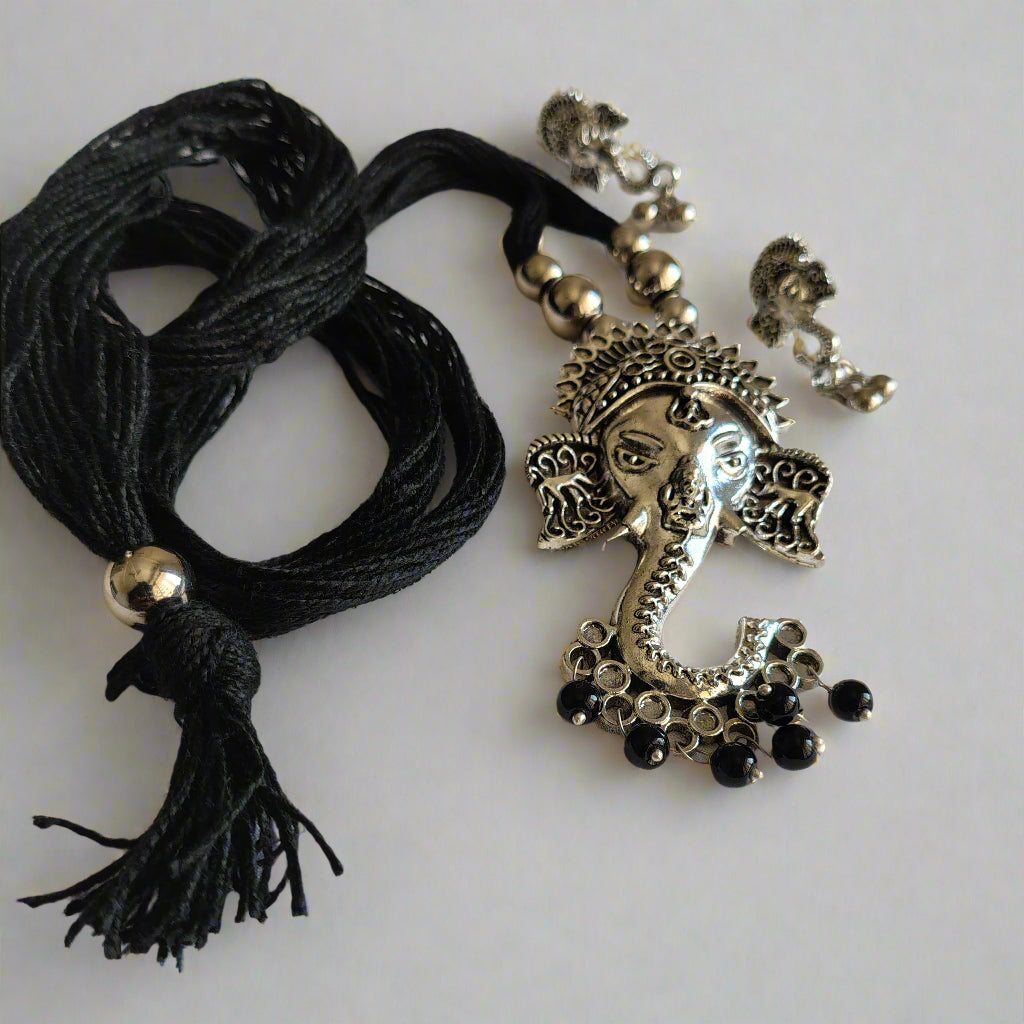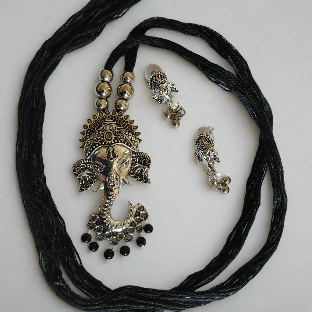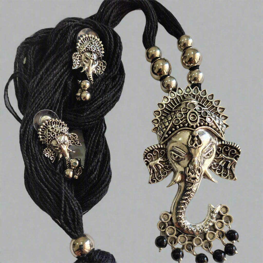 Embrace divine elegance with this silver-toned Ganesha pendant necklace set, complete with matching earrings. Adorned with intricate detailing and delicate black bead accents, it's the perfect choice for festive occasions and traditional wear.
