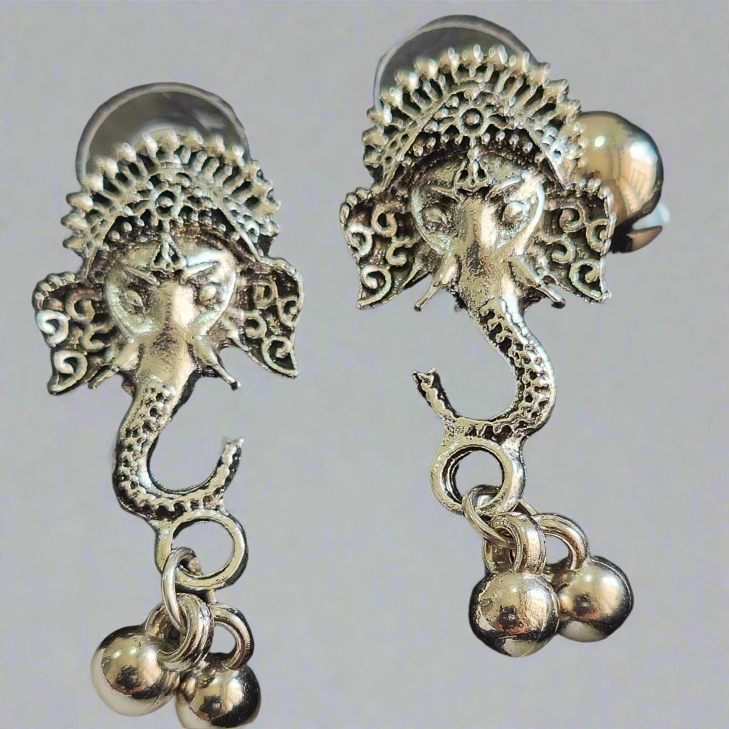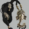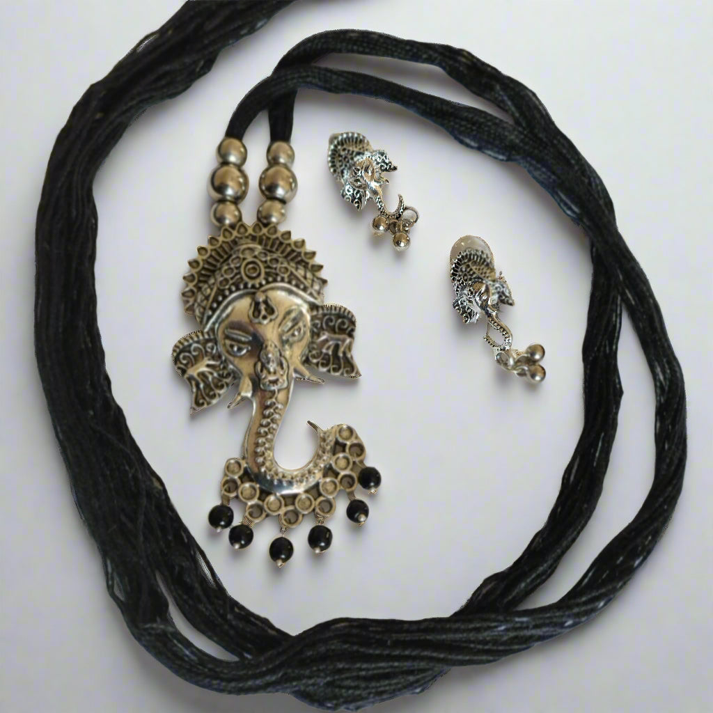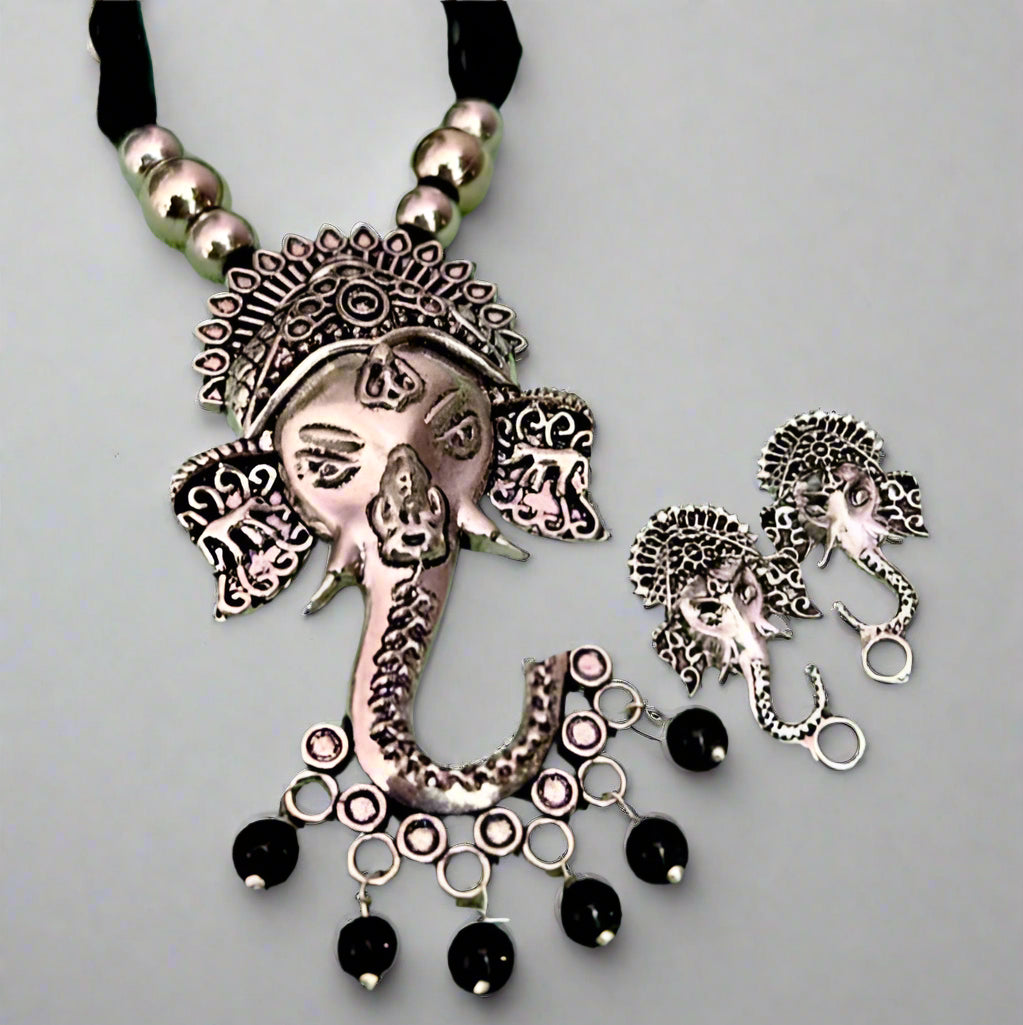 Embrace divine elegance with this silver-toned Ganesha pendant necklace set, complete with matching earrings. Adorned with intricate detailing and delicate black bead accents, it's the perfect choice for festive occasions and traditional wear.