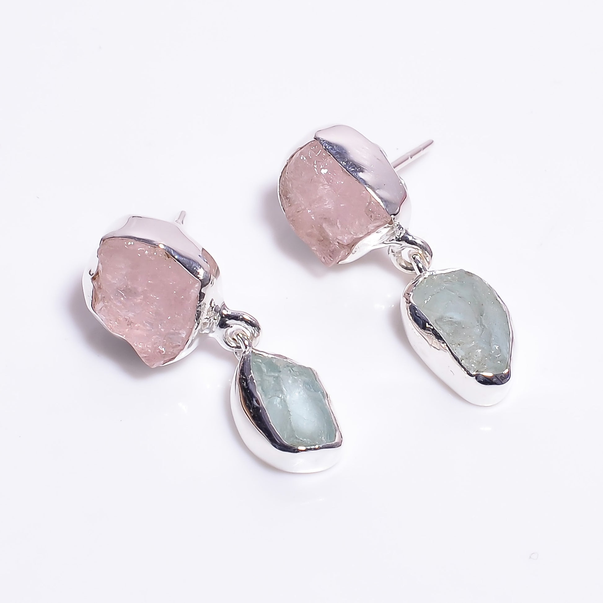 Natural Raw Rose Quartz Aquamarine Gemstone 925 Sterling Silver Earrings