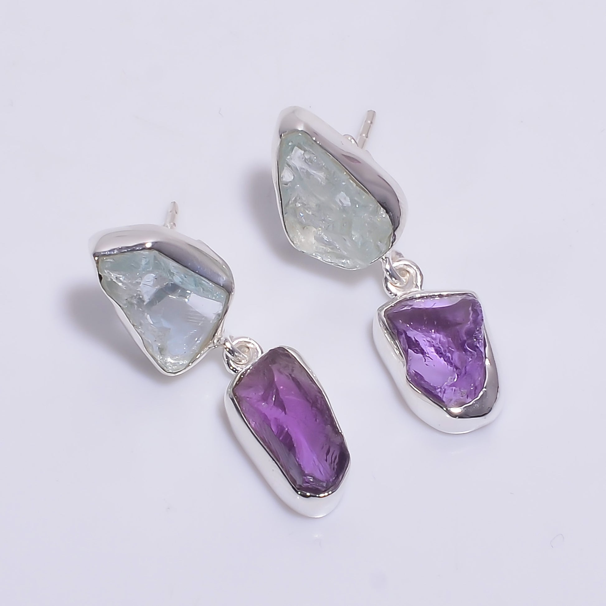 Aquamarine Amethyst Raw Gemstone 925 Sterling Silver Earrings